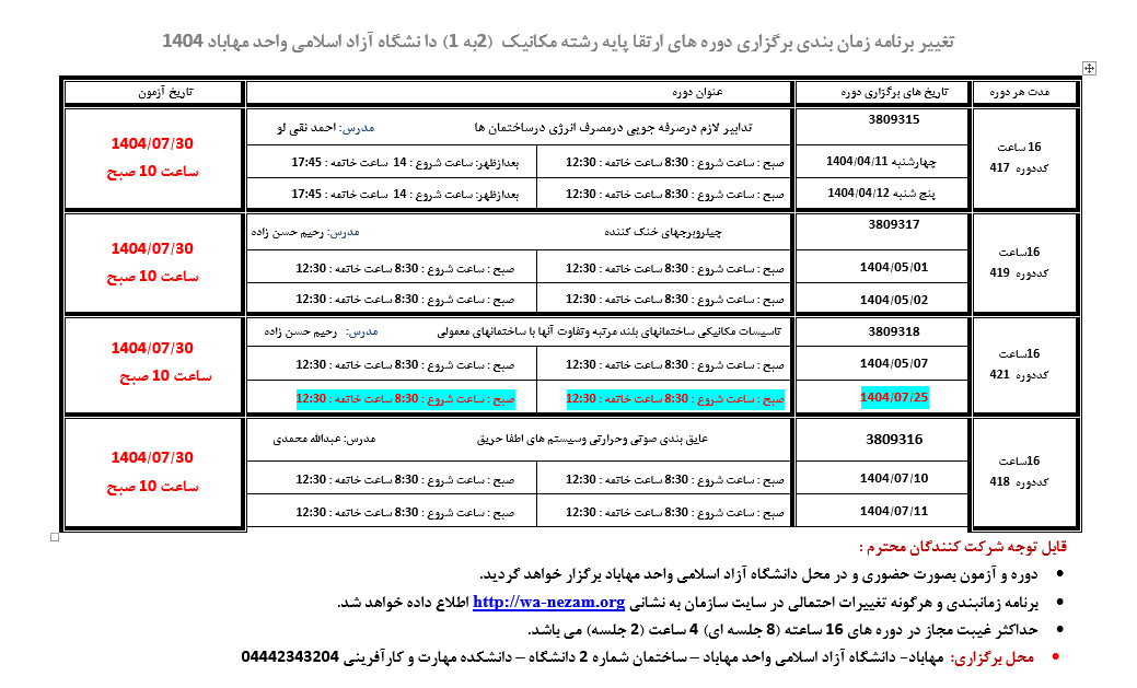 تغییر برنامه دوره های ارتقاء پایه مکانیک(2به1) | مجری: دانشگاه آزاد اسلامی واحد مهاباد | دانلود |