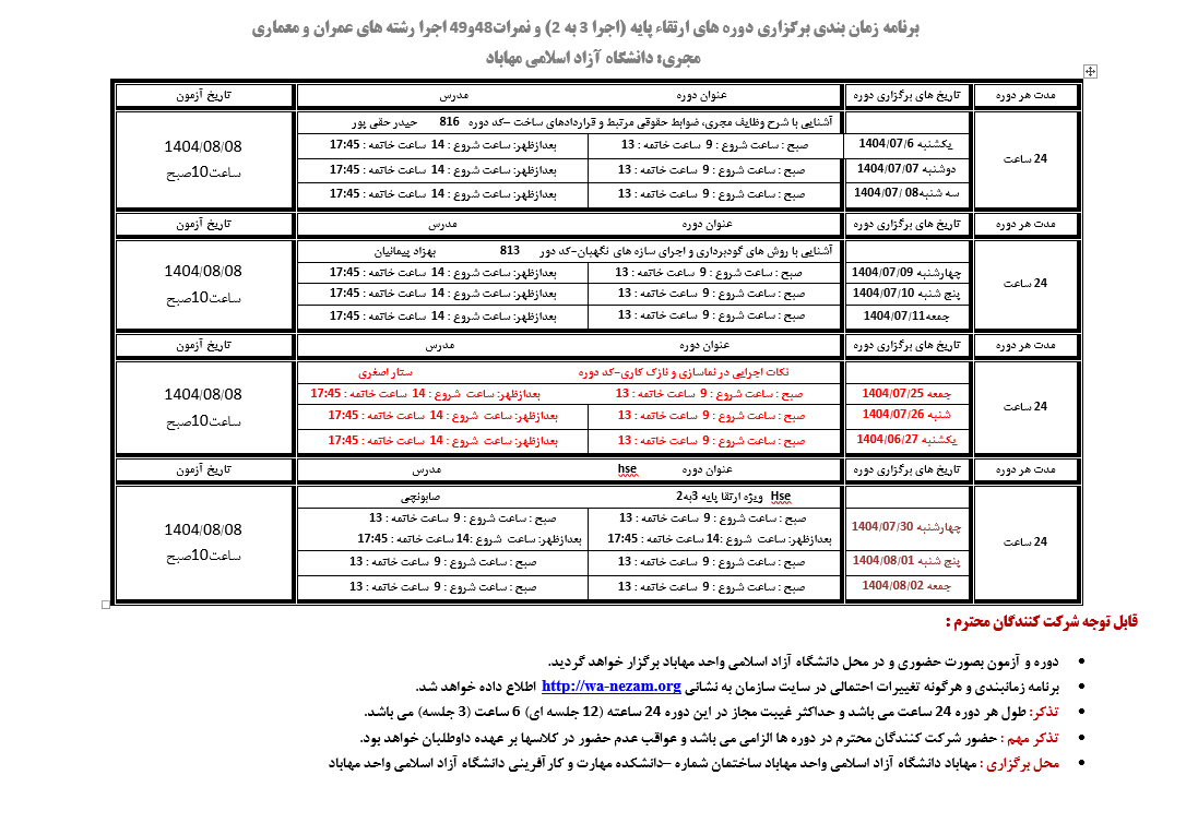 برنامه دوره های ارتقا پایه(اجرا3به2) و کسری نمرات48و49 اجرا-رشته عمران و معماری | مجری: دانشگاه آزاد اسلامی واحد مهاباد | دانلود |