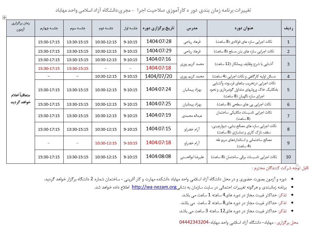 تغییربرنامه دوره های عمران(نظارت3به2) و کسری نمرات48 و 49 عمران نظارت | مجری: دانشگاه آزاد اسلامی واحد مهاباد | دانلود |