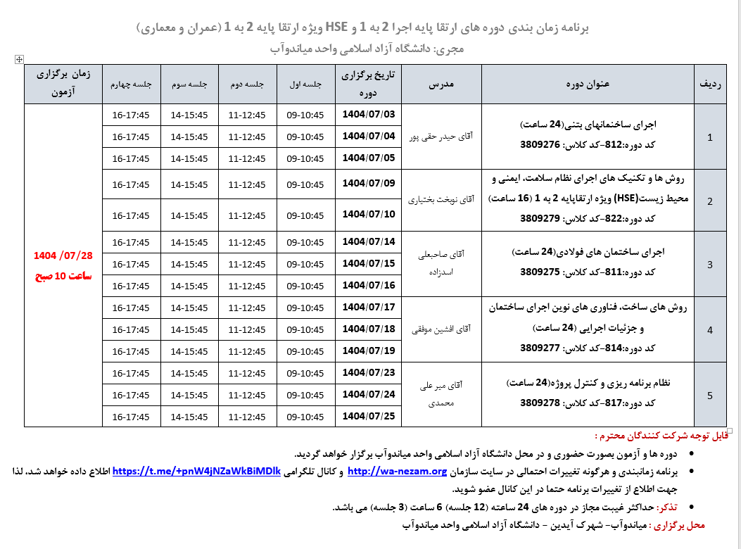 برنامه دوره های ارتقا پایه عمران(نظارت3به2) و نمرات48و49 عمران نظارت | مجری: دانشگاه آزاد اسلامی واحد میاندوآب | دانلود |