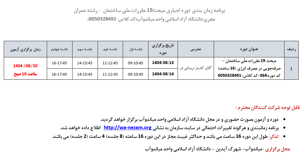 تغییر برنامه دوره مبحث19 مقررات ملی ساختمان-رشته عمران | ویژه ثبت نام کنندگان زمستان1402-گروه3 دانشگاه آزاد اسلامی واحد میاندوآب | دانلود |