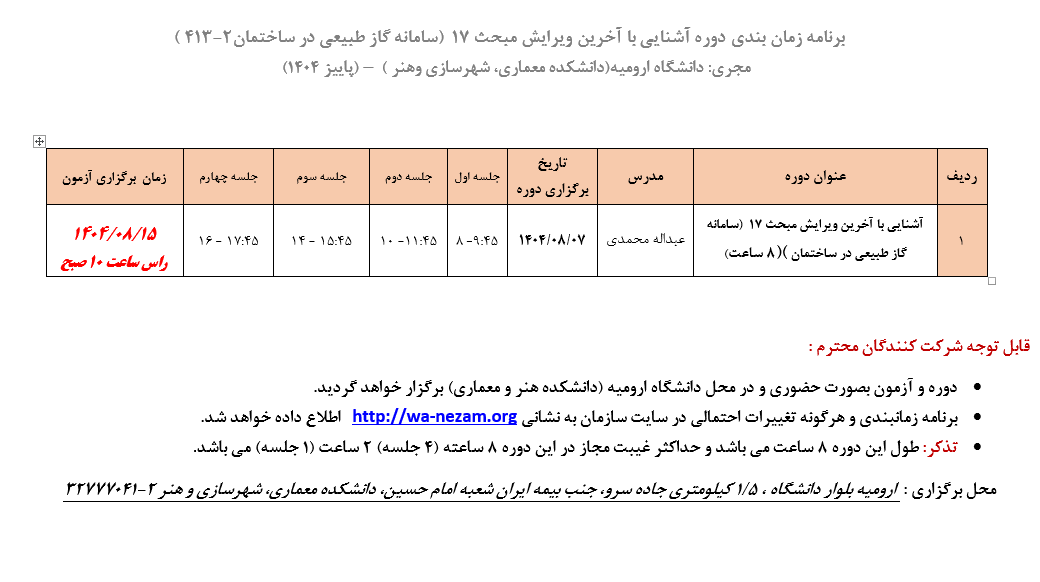 برنامه دوره آشنایی با آخرین ویرایش مبحث 17 ( سامانه گاز طبیعی در ساختمان )