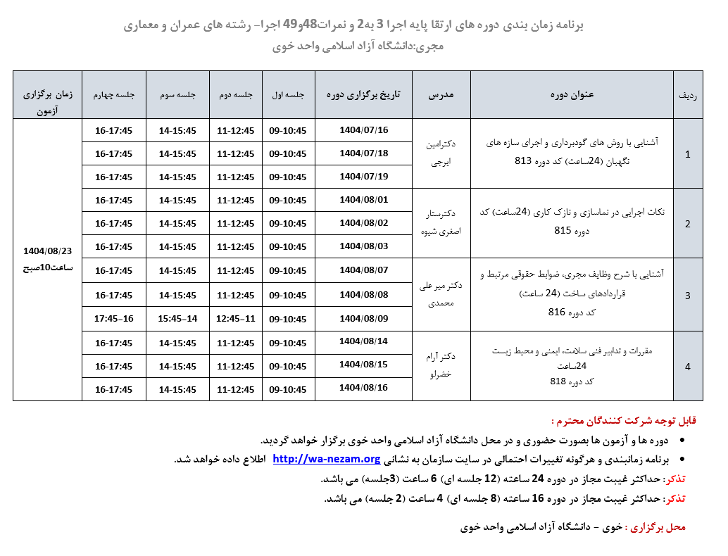 برنامه دوره های نمرات48و49-رشته عمران و معماری(اجرا) | مجری: دانشگاه آزاد اسلامی واحد خوی | دانلود |