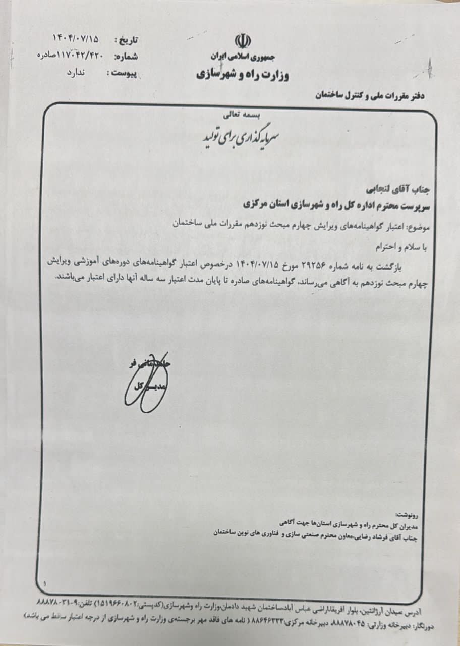 با استناد به بخشنامه شماره 17620/420 مورخ 10/02/1402 دفتر مقررات ملی و کنترل ساختمان مبنی بر الزامی شدن گذراندن دوره مبحث19 مقررات ملی ساختمان(صرفه جویی در مصرف انرژی) برای متقاضیان تمدید و ارتقاء پایه مهندسان رشته های عمران(نظارت3به2و2به1)، معماری(نظارت و طراحی 3به2و 2به1)، تاسیسات برقی(نظارت و طراحی3به2و2به1) وتاسیسات مکانیکی(نظارت و طراحی3به2و2به1) بعنوان یک دوره اجباری اضافه بر دوره های آموزشی ارتقاء پایه و برای تمدید رشته های مذکور ، لذا ارائه گواهی دوره مربوط اجباری بوده و در صورت عدم ارائه در سامانه سپامک، درخواست متقاضی رد خواهدشد. ضمنا در هر مرحله از تمدید و ارتقاء هر صلاحیت مثلا ارتقاء صلاحیت محاسبات رشته عمران ، در صورتیکه برروی پروانه اشتغال صلاحیت نظارت از قبل موجود هست بایستی علاوه بردوره های ارتقاء پایه محاسبات ، دوره مبحث 19 نیز ارائه گردد.