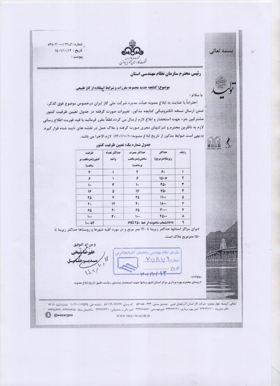 ابلاغیه جدید جدول تعیین ظرفیت کنتور بر اساس کتابچه جدید مجموعه مقررات و شرایط استفاده از گاز طبیعی