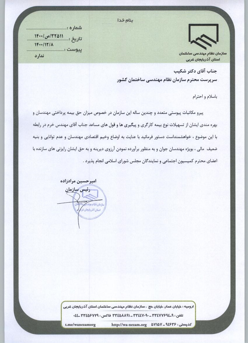 نامه رئیس سازمان به شورای مرکزی در خصوص پیگیری بیمه تامین اجتماعی مهندسان