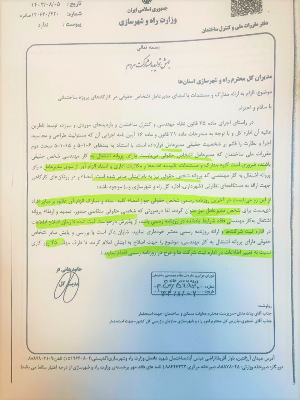 از کلیه شرکتهای حقوقی دارای پروانه اشتغال به کار اعم از آزمایشگاه، سازنده، انبوهساز و ... خواهشمند است تا تاریخ 23 آذر ماه 1403 جهت کنترل شناسه ملی خود در سامانه سپامک، به سامانه ورود کنند و در صورتی که با مشکلی مواجه شدند به کارشناسان صدور پروانه نظام مهندسی استان و یا راه و شهرسازی اطلاع دهندمهلت اعلامی ضرب العجل بوده و به هیچ وجه تمدید نخواهد گردید مسئولیت عدم اقدام بموقع برعهده خود مهندسین می باشد و سازمان نظام مهندسی استان و اداره کل راه و شهرسازی هیچ مسئولیتی در قبال عدم پیگیری اعضا نخواهد داشت .